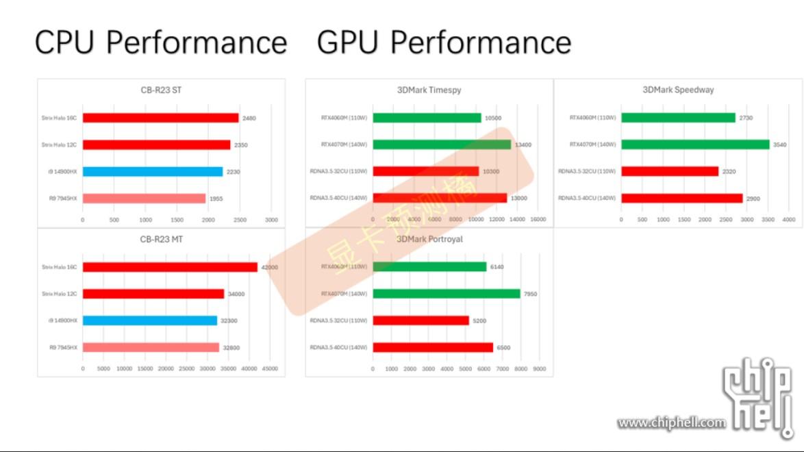 L’auteur spécule 2480 points en ST et 42 000 points dans Cinebench R23 pour le processeur Strix Halo à 16 cœurs ; 2350 et 34 000 points respectivement pour celui à 12 cœurs. Ces valeurs permettraient aux deux Strix Point de devancer légèrement le Core i9-14900HX en ST (2230 points) ; de le surclasser en MT (32 300 points) dans le cas du modèle 16 cœurs. Ici, rien de très irrationnel. Au passage, nous avons vérifié, les résultats des processeurs Ryzen 9 et Core i9 utilisés pour la comparaison sont authentiques.