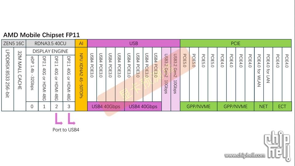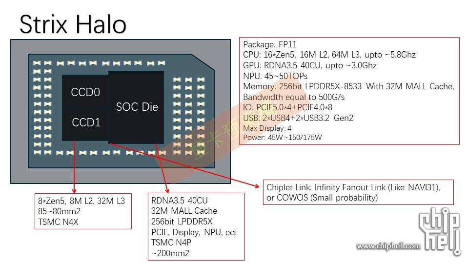 Les spécifications publiées sur Chiphell confirment les ingrédients de la recette susmentionnée : jusqu’à 16 cœurs Zen 5 via deux CCD cuisinés par TSMC en N4X ; un maximum de 40 unités de calcul RDNA 3.5 pour le GPU (soit 2 560 processeurs de flux, 80 accélérateurs AI, 40 accélérateurs Ray tracing ; d'autre part, AMD parle de RDNA 3+ et non de RDNA 3.5), lequel serait conçu sur nœud N4P. Le tout accompagné d’un NPU délivrant 45-50 TOPS, donc basé sur l'architecture XDNA 2. La salinité de l’ensemble serait élevée : fréquence CPU maximale donnée à 5,8 GHz environ, fréquence GPU de 3 GHz, prise en charge de la LPPDR5X-8533.