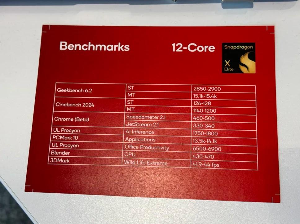 Venons-en maintenant aux soupçons de bidonnage. Outre les benchmarks mis en évidence lors des présentations, Qualcomm a, tel que rapporté en début d’article, régulièrement invité des journalistes à des évènements privés. L’entreprise y exposait quelques ordinateurs munis de Snapdragon X Elite, lesquels étaient souvent accompagnés d’une petite fiche, à l'image de celle-ci dessous, contenant divers résultats de benchmarks (avec des scores bien quantifiés).