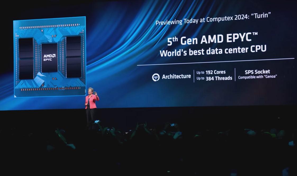 Enfin, AMD n’a pas formellement dévoilé sa gamme de processeurs EPYC Turin pour les centres de données. Lisa Su a néanmoins confirmé quelques données clefs, notamment leur nombre maximal de cœurs CPU : il s’élève à 128 cœurs Zen 5 ou 192 cœurs Zen 5c. La société a vanté la supériorité de ses puces sur les Intel Xeon. Les EPYC Turin sortiront avant la fin d’année.