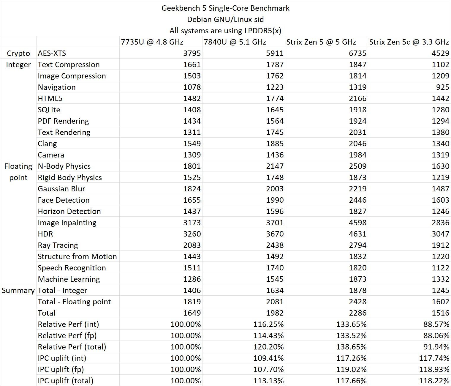 Terminons avec des processeurs dont l’existence est bien certifiée. David Huang, un testeur hardware réputé, prétend avoir en sa possession un ordinateur muni d’un processeur Strix Point, en l’occurrence d’un Ryzen 9 AI 365. Des deux comparses, c’est le moins bien achalandé : il a 10 cœurs CPU (quatre cœurs Zen 5 et six cœurs Zen 5c) et booste à 100 MHz de moins (5,0 GHz). Son iGPU est aussi bien moins puissant, mais cette disparité n’a pas d’incidence dans l’examen conduit ici, qui porte seulement sur les performances CPU ; plus précisément, sur les gains d’IPC, via de nombreux tests qui plafonnent volontairement les fréquences des processeurs Zen 3, Zen 4 et Zen 5 utilisés. Les concurrents sélectionnés sont les Ryzen 7 7840U (Zen 4) et Ryzen 7 7735U (Zen 3+).