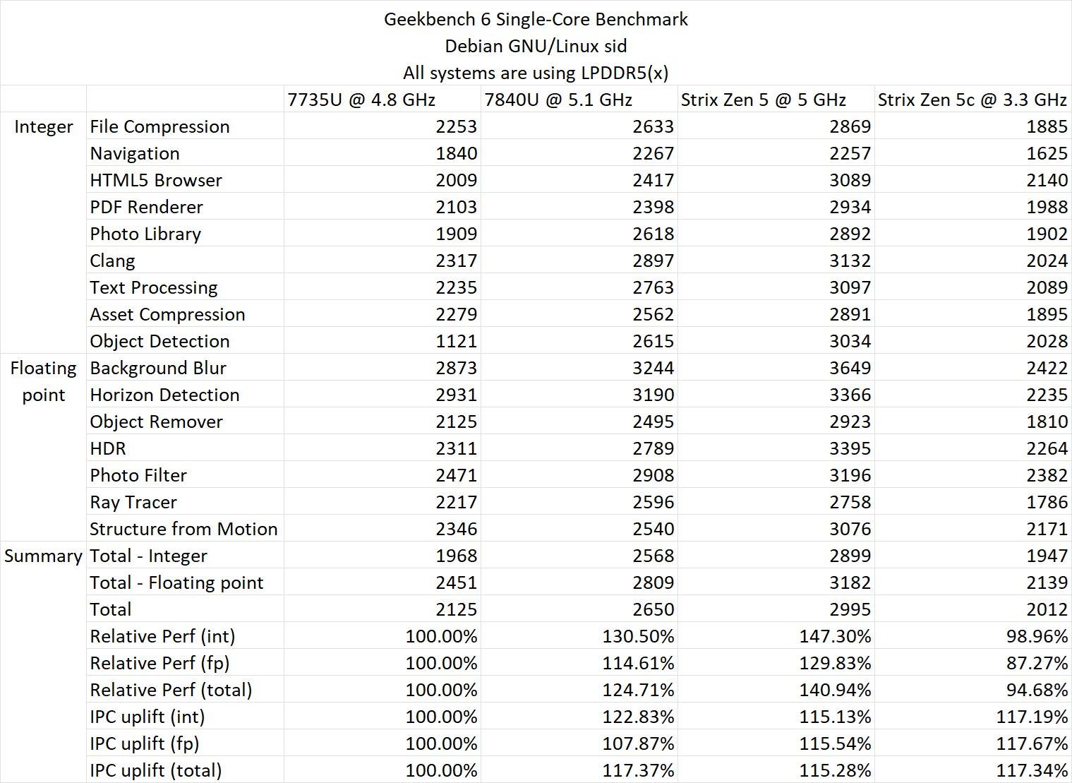 En moyenne, pour les cœurs Zen 5, les mesures aboutissent à une hausse de 9,71 % par rapport à Zen 4 dans la suite SPEC CPU 2017 integer rate-1 ; la hausse est de 15,28 % dans Geekbench 6 en ST et de 17,66 % en ST dans Geekbench 5.