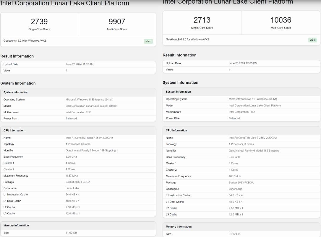 Terminons avec deux entrées Geekbench 6.3, benchmark dans lequel s’est aventuré l’Intel Core Ultra 268V hier.