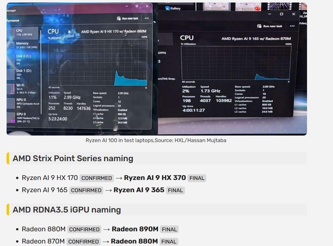 Même son de cloche chez WCCFTech : Hassan Mujtaba note que « le schéma de dénomination "160" a été utilisé par les premiers échantillons d'ingénierie avant qu'AMD ne décide de passer à la nouvelle marque de la série "300". Cette puce sera donc appelée Ryzen AI 7 PRO 360 » ; logique. Pourtant, il ajoute ensuite que le processeur « dispose également d'une Radeon 870M iGPU qui, d'après son nom, devrait conserver la même architecture de GPU RDNA 3.5, mais avec un nombre réduit de cœurs. La Radeon 890M dispose de 16 CUs, et la 880M de 12 CUs, nous pouvons donc nous attendre à 8 CUs pour la 870. »