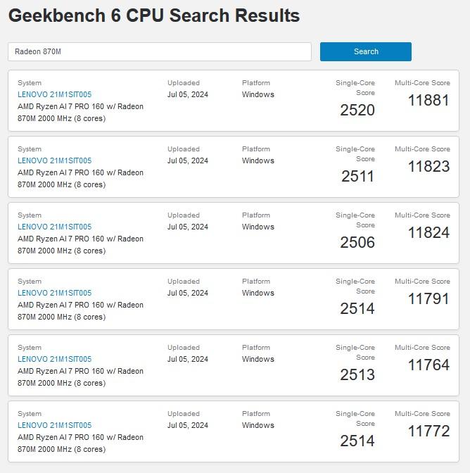 En conséquence, y compris dans les dernières entrées Geekbench pour l’AMD Ryzen 9 AI HX 170, il est toujours question d’un Radeon 880M (il n'y a pas de résultats pour le Ryzen AI 9 165 ; toutes les occurrences Radeon 870M correspondent à celles du Ryzen AI 7 PRO 160 ; enfin, il n'y aucune trace de Ryzen AI 7 PRO 360 pour l'instant).
