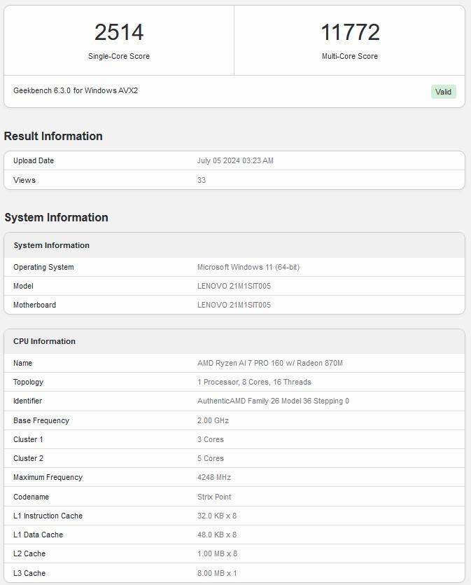 C’est depuis chose faite pour le plus frêle de ces Ryzen AI Pro : il a fait un passage ce matin dans Geekbench véhiculé dans un PC Lenovo. Le logiciel indique que ce Ryzen 7, appelé AMD Ryzen AI 7 PRO 160 w/ Radeon 870M (cela a son importance, nous y reviendrons plus tard) possède 8 cœurs / 16 threads, dans une très étonnante configuration 3 + 5 (3 cœurs Zen 5 et 5 cœurs Zen 5C).