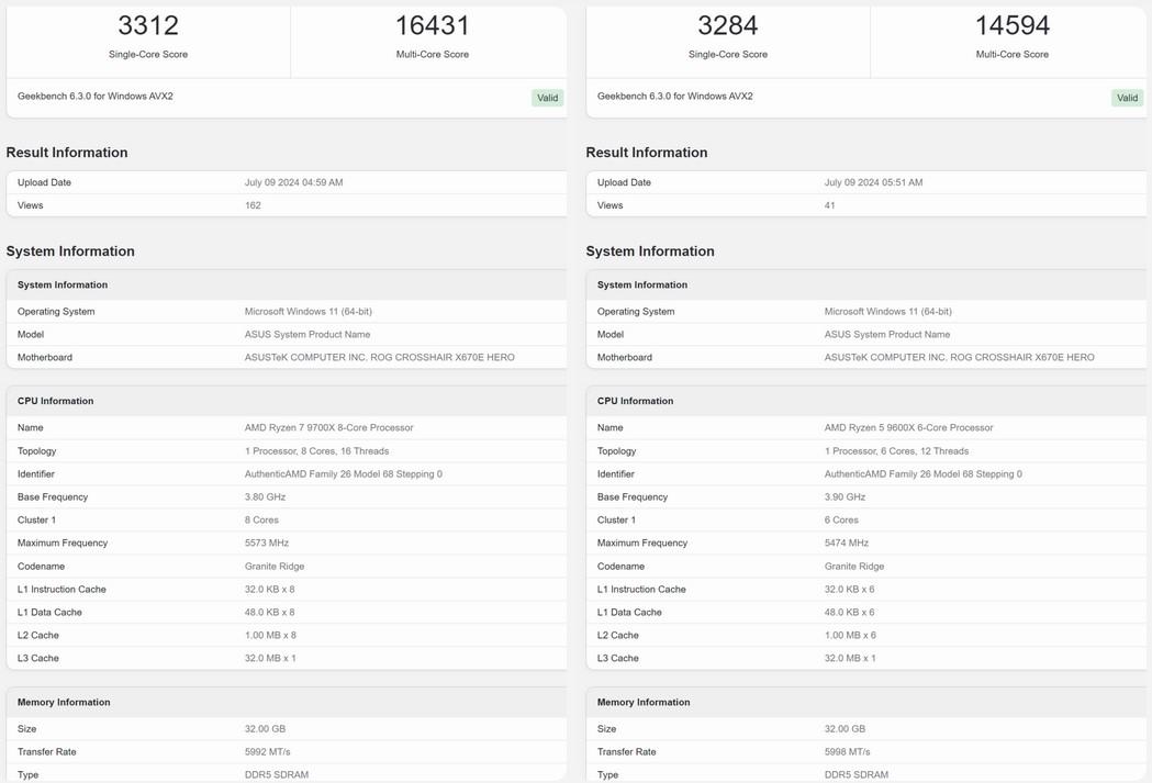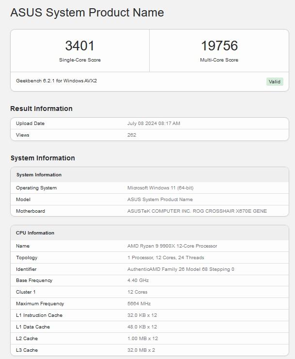 Au petit matin de ce lundi 8 juillet 2024, ce processeur a donc fait irruption dans Geekbench. Les conditions de test sont inconnues (système de refroidissement utilisé, fonctionnalités PBO, etc.). A priori, PBO n'est pas activé ; avec forcément une incidence néfaste sur les performances du Ryzen. Ceci dit, installé sur une carte mère ASUS ROG Crosshair X670E Gene et associé à 32 Go de DDR5, ce processeur réalise déjà 3401 points en single-core et 19 756 points en multi-core.