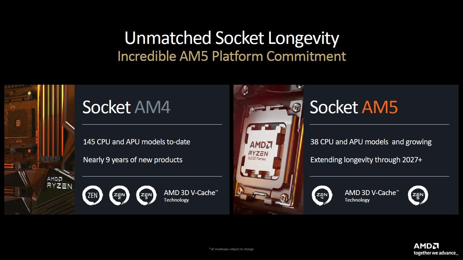 Comme promis, les processeurs Ryzen 9000 exploitent le socket AM5 ; plateforme que les Ryzen 7000 ont étrennée il y a deux ans. À ce sujet, sachez qu’AMD évoque une longévité au moins jusqu’en 2027 pour ce socket.