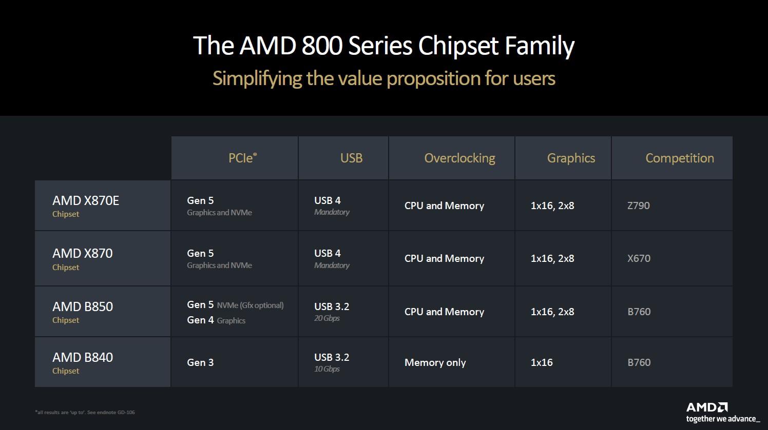 Les cartes mères série 600 prennent en charge les nouveaux venus. Néanmoins, AMD proposera des chipsets série 800 à travers les X870E / X870, B850 et B840. Nous avions publié cette même diapositive à la mi-juillet pour parler des chipsets B850 et B840. Il n'y a rien de neuf, et nous ne savons pas quand ces cartes mères arriveront ; nous ne nous éternisons donc pas sur ce sujet.