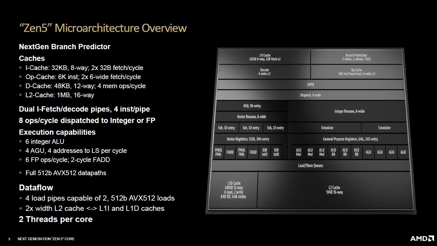 La diapositive ci-dessous, fournie par AMD, donne un aperçu général du cœur Zen 5. Les deux qui suivent relèvent les avancées de Zen 5 par rapport à Zen 4. Elles mettent notamment en évidence une bande passante doublée pour le cache L2.