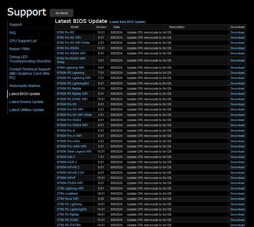 Du côté d’ASRock, ce BIOS 0x129 est désormais disponible pour pléthore de cartes mères B760 et Z790 ; les premières élues furent toutefois les H610M-HDV et H610M-HVS. Là encore, vous trouverez le lien pour chaque modèle en suivant le lien ci-dessus.