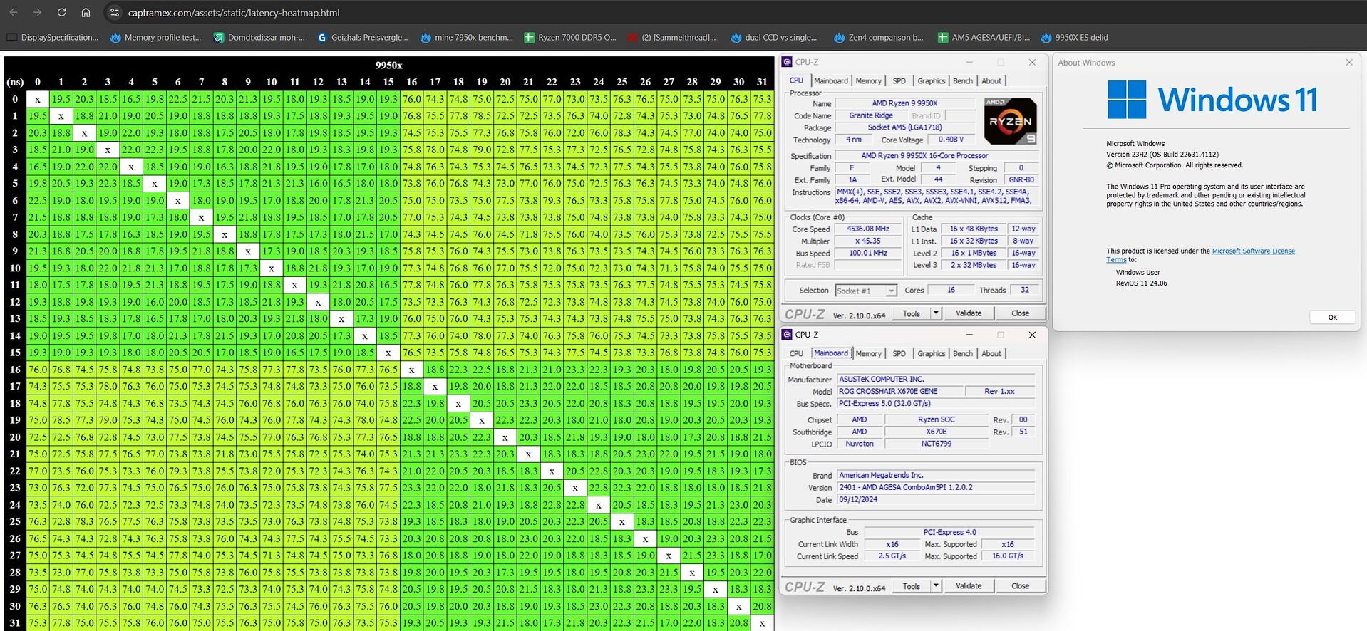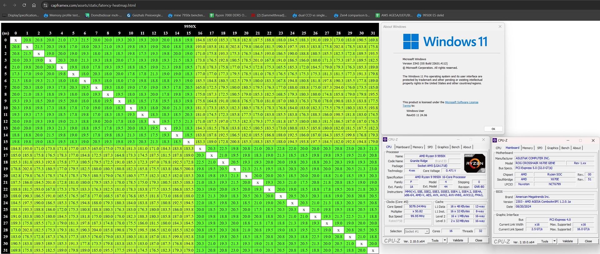 Constat similaire chez domdtxdissar. Le logiciel CapFrameX core-to-core latency tool mesure 75 ns de latence contre environ 180 ns auparavant. Ces données valent également pour un Ryzen 9 9950X, ici installé sur une carte mère ASUS ROG Crosshair X670E Gene.
