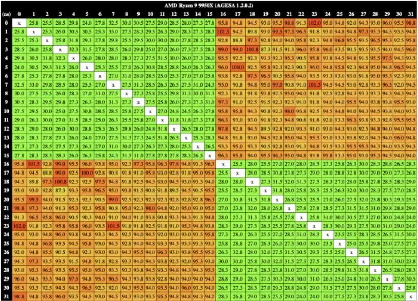 Notre confrère de HardwareLuxx avait relevé plus de 200 ns de latence entre les deux CCD de son Ryzen 9 9950X lors de son test initial. Cette valeur était plus élevée que pour des processeurs d’anciennes générations : la latence avoisinait les 80 / 85 ns pour les Ryzen 9 5950X et Ryzen 9 7950X. Avec l’AGESA 1.2.0.2, Andreas Schilling obtient désormais 95 ns pour son Ryzen Zen 5.