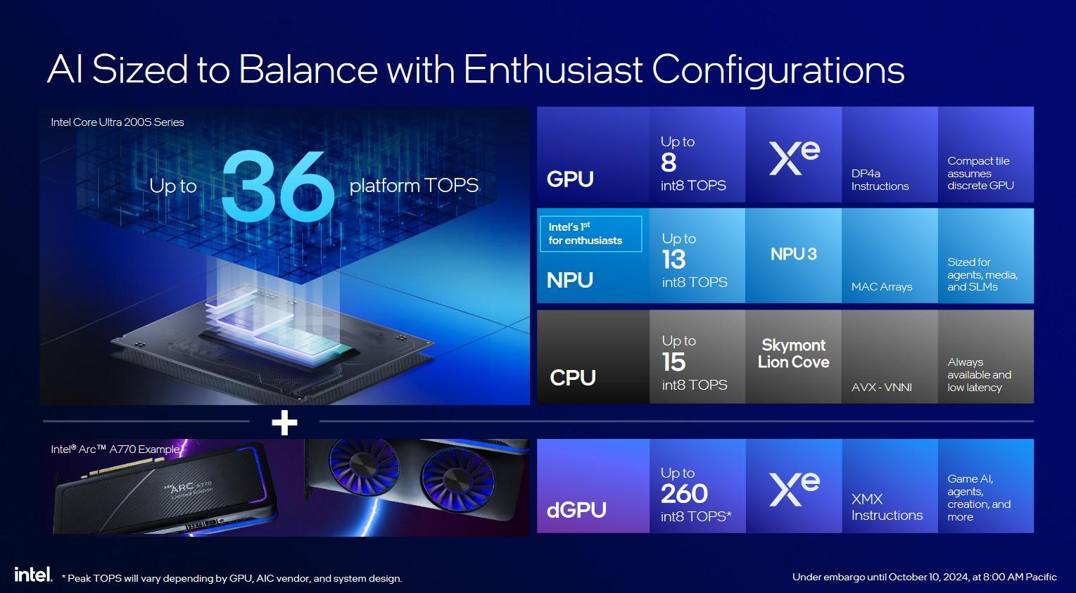 Ces Core Ultra 200 peuvent également se targuer d’être les premiers processeurs desktop à intégrer une NPU (Neural Processing Unit). Bon, avec une estimation de puissance donnée à 36 TOPS pour l’ensemble du processeur (8 TOPS par le GPU, 13 par le NPU et 15 par le CPU), ces Arrow Lake-S ne rendent pas un PC éligible Copilot+ (le seuil étant fixé à 40 TOPS par Microsoft).