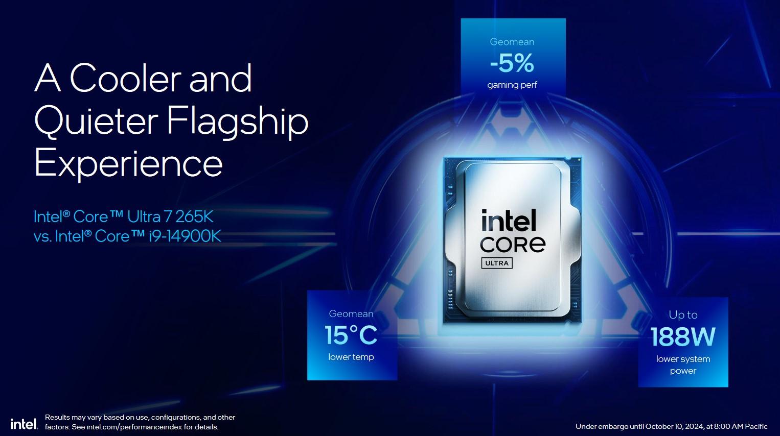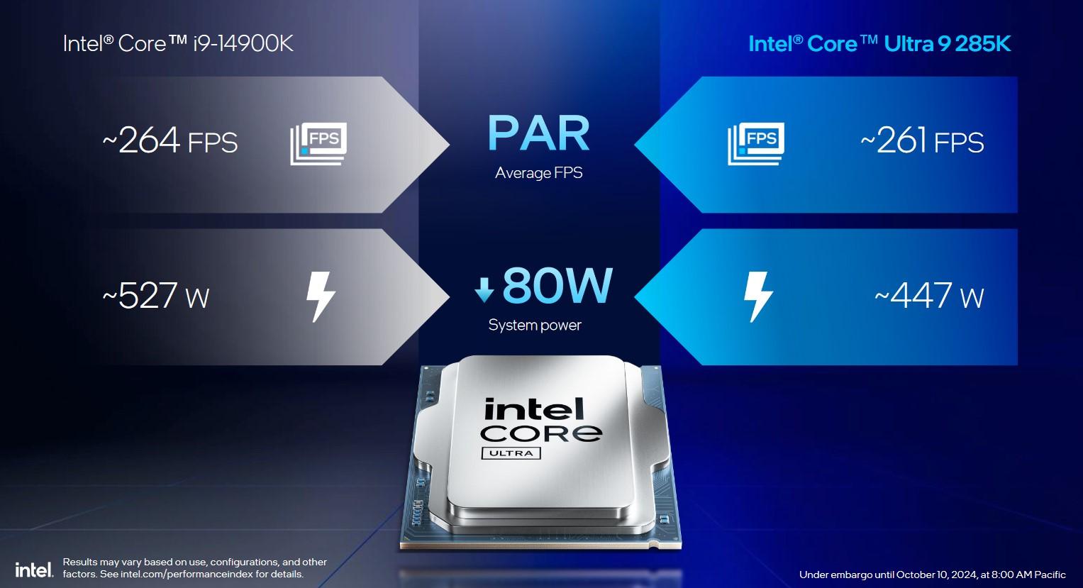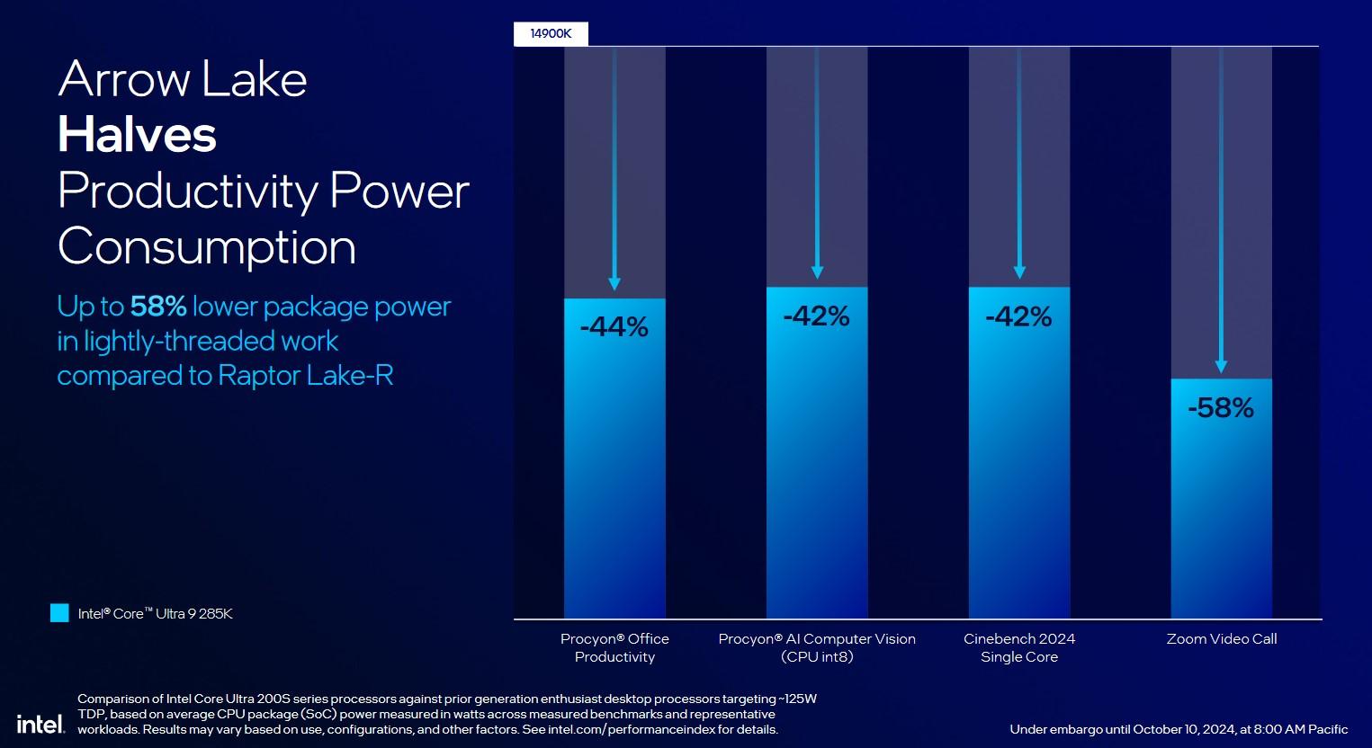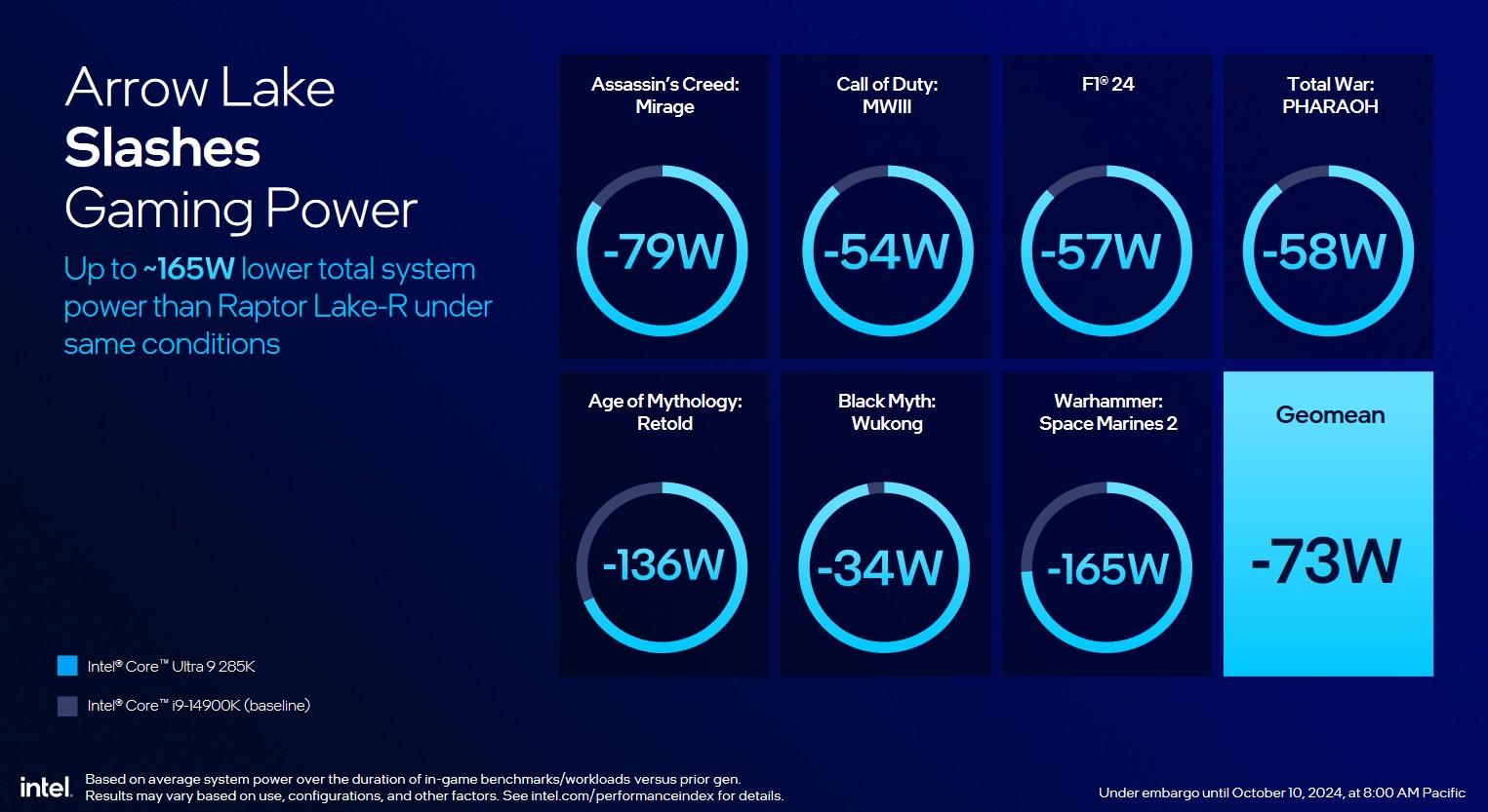 Pour son vaisseau amiral, Intel revendique jusqu'à 58 % de réduction de la puissance pour des tâches de productivité par rapport au Core i9-14900K. Dans les jeux, l’entreprise évoque une réduction moyenne de 73 W pour l'ensemble du système.