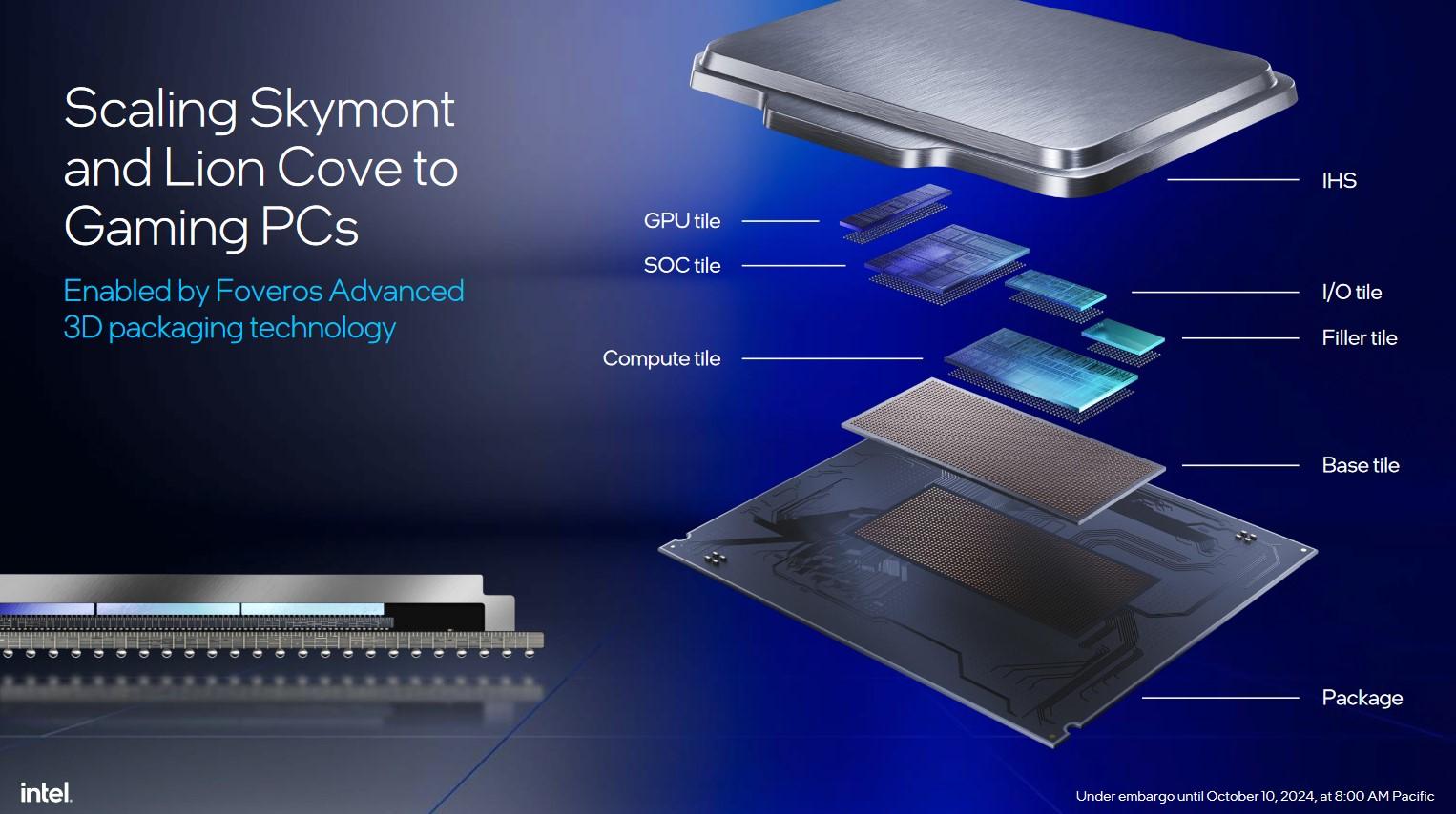 En matière de cœurs CPU, les P-cores exploitent la micro-architecture Lion Cove ; les E-cores, Skymont. Les cœurs partagent jusqu'à 36 Mo de cache L3. La configuration de la mémoire cache L2 passe de 2 Mo à 3 Mo pour les P-cores. Intel renseigne une hausse de 9 % des IPC par rapport au Raptor Cove des Raptor. Les Efficient Cores, sous archi Skymont, ont toujours 4 Mo de cache L2 par clusters de quatre, mais avec une bande passante doublée. Ils profitent d'IPC 32 % plus élevés par rapport à Gracemont.
