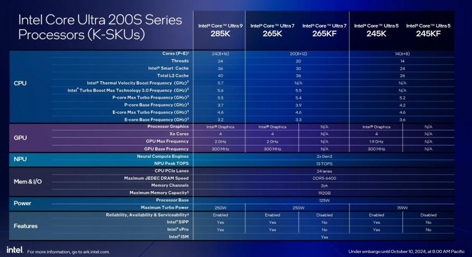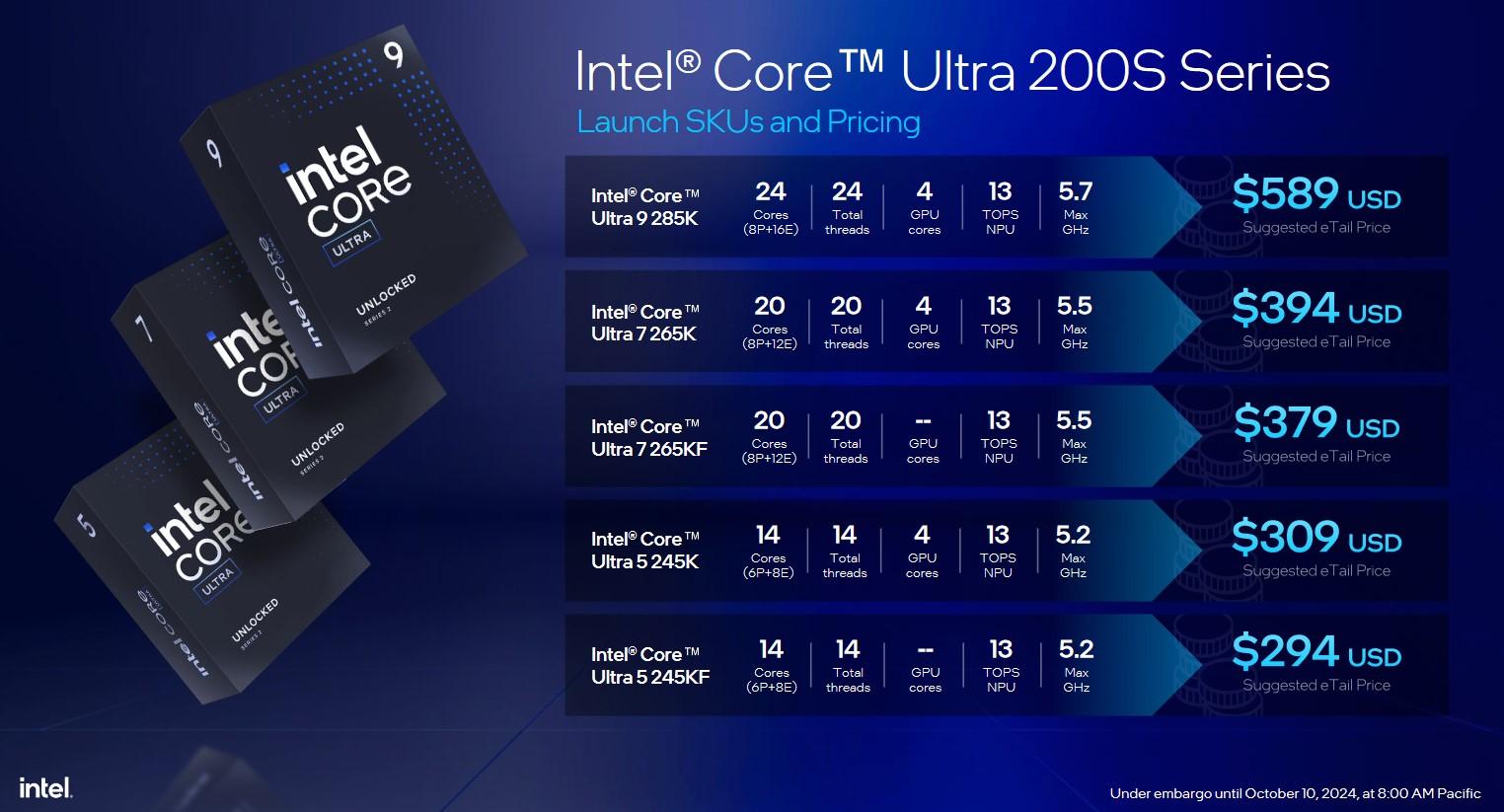 | Core Ultra 9 285K | 24C / 24T (8P+16E) | 5,7 GHz | 125W | 589 dollars |