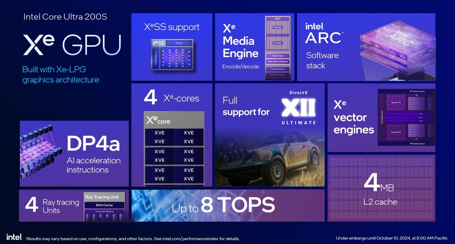 Quant à l’iGPU des Arrow Lake-S, il exploite l'architecture Xe-Cores (Xe-LP). À l’instar de celui des Ryzen 7000 et Ryzen 9000, c’est un processeur graphique d’appoint : il possède jusqu'à 4 Xe-Cores et jusqu'à 4 Ray Tracing Units ; prend en charge DirectX 12 Ultimate ; son moteur Xe Media a les mêmes capacités d'encodage que les GPU Alchemist (encodage AV1/AVC/HEVC, etc.). De plus, il supporte les instructions DP4a, l’un des leviers de mise en œuvre de la mise à l'échelle XeSS.