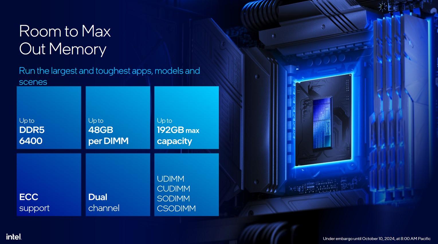 Les Arrow Lake-S prennent place sur une carte mère LGA-1851. La proposition initiale des chipsets série 800 se limite au Z890. La mise à jour la plus importante est la prise en charge de 20 lignes PCIe 5.0 contre 8 autrefois. Malheureusement, Intel ne dit rien sur l’avenir de ce socket. À ce stade, en dehors des Core Ultra 200, son futur reste donc incertain. Côté mémoire, les Arrow Lake-S prennent nativement en charge la DDR5-6400 mais certains modules, dont les CUDIMM, iront bien sûr au-delà.