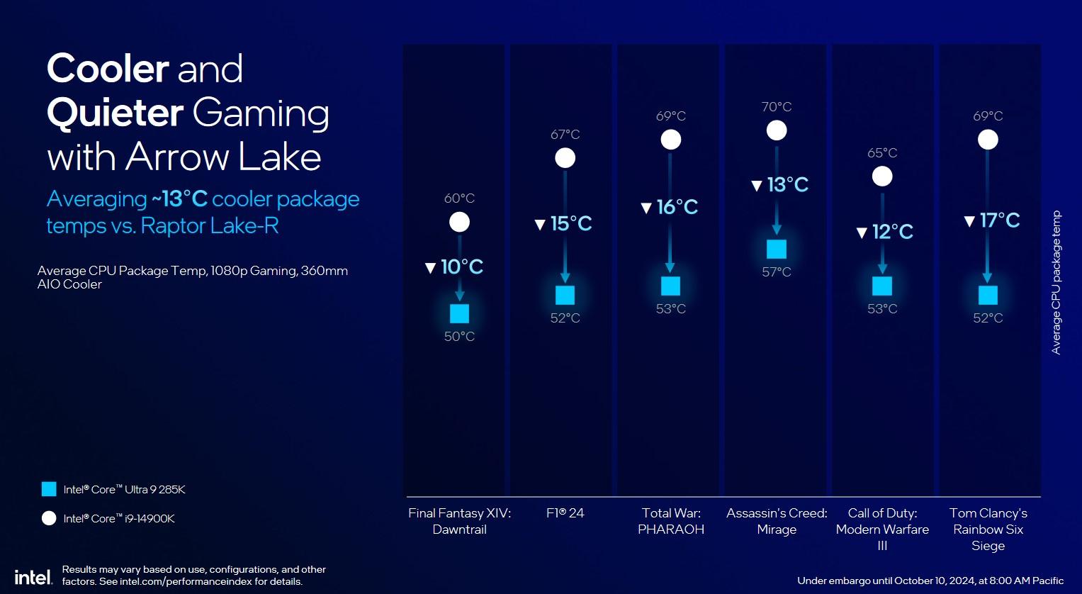 Conséquence de cet appétit plus mesuré : des températures inférieures d’une quinzaine de degrés, à en croire les mesures d’Intel, dans plusieurs jeux (avec un AIO 360 mm).