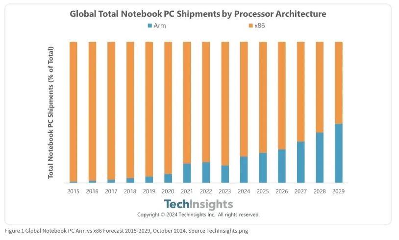 La décision d’Intel et d’AMD de s'associer pour développer l’ISA x86 trahit certainement leur crainte : que l'avenir de ces processeurs soit de plus en plus menacé par des solutions alternatives ; d'où la nécessité de cheminer main dans la main pour assurer la pérennité de cette plateforme. Un rapport de TechInsights (via ITHome) confirme cette idée : l’étude table sur 40 % d’ordinateurs portables basés sur des SoC Arm d’ici la fin de la décennie.