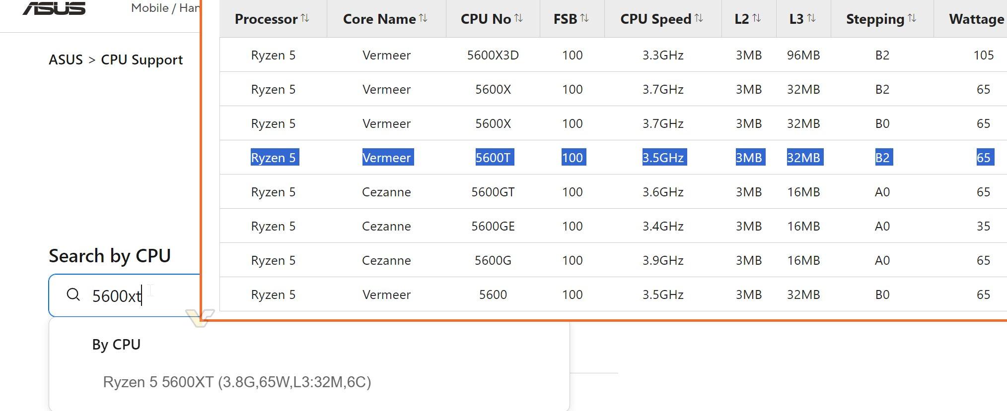 Certains fabricants, à l’image d’Asus, ont déjà intégrés ces deux Ryzen à leur base de données. Dans l’exemple donné ci-dessous, le Ryzen 5 5600XT est présenté comme ayant une fréquence de base de 3,8 GHz et un TDP de 65 W. Le Ryzen 5 5600T a pour sa part une fréquence de base de 3,5 GHz.