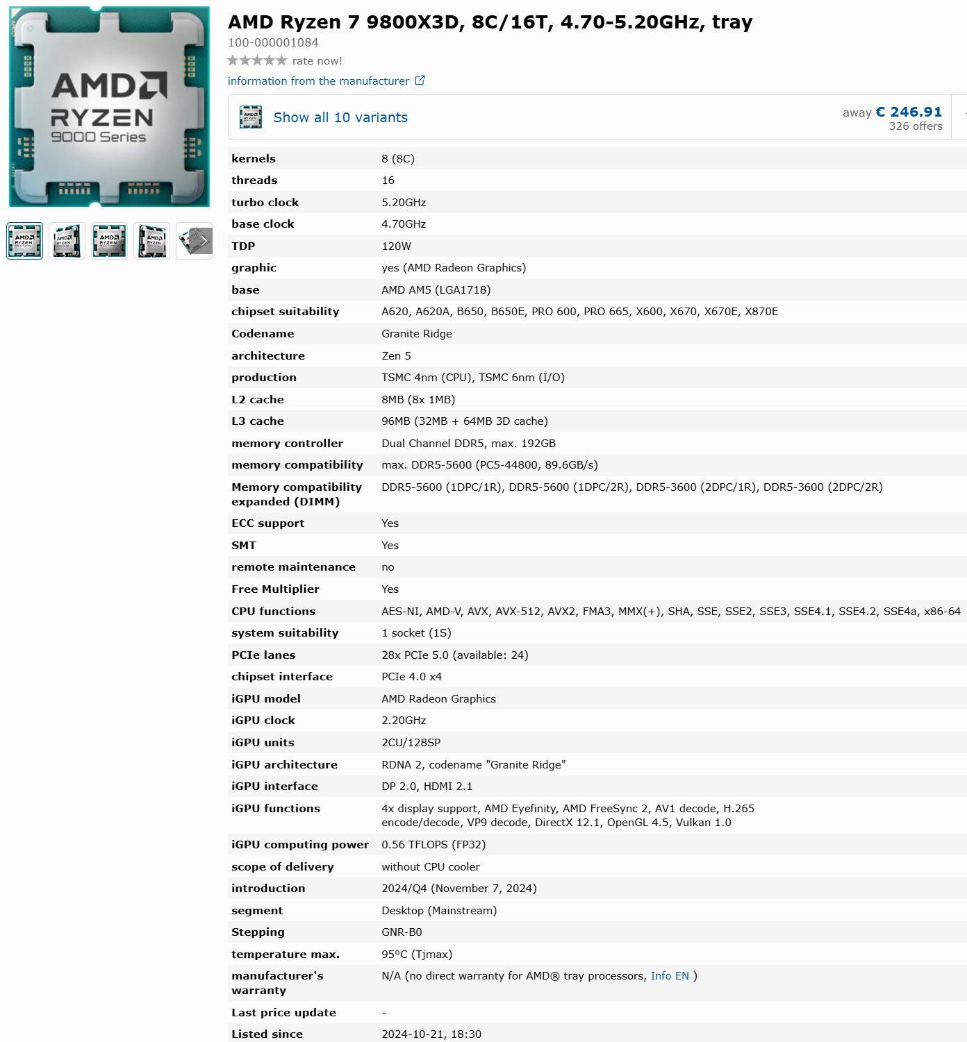Quoi qu’il en soit, en pratique, ce déclassement du cache 3D au rez-de-chaussée au profit d'un CCD contenant les cœurs CPU surclassé dans l’étage supérieur aboutit bien à des fréquences plus élevées. Le détaillant Geizhals a récemment référencé le Ryzen 7 9800X3D avec l’ensemble de ses caractéristiques. Outre la fréquence Boost de 5,2 GHz entérinée par le document d’AMD précité, nous avons confirmation d’une fréquence de base de 4,7 GHz ; c’est 500 MHz de plus que celle du Ryzen 7 7800X3D. Enfin, le processeur a bien un TDP de 120 W.