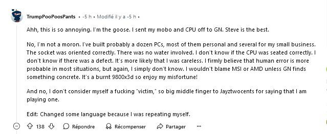 L’affaire vous rappellera certainement celle de la fonte des connecteurs d’alimentation des RTX 4090 — résumée dans la célèbre chanson Allumeeeeeeez le « 12VHPWR » feu — ou celle des Ryzen 7000 endommagés par des tensions trop élevées. Deux cas de Ryzen 7 9800X3D transformé en grille-pain agitent les forums : l’un sur Reddit, l’autre sur Quasarzone. Et si la victime est toujours la même, un témoin rôde sur les deux scènes de crime : la carte mère MSI MAG X870 Tomahawk Wi-Fi. Suspectée, MSI a plaidé l’innocence de sa création.