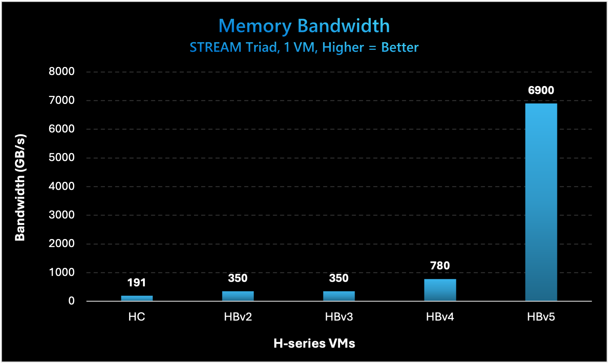 Pour de nombreux clients HPC, les performances de la mémoire des serveurs standard sont devenues l'obstacle le plus important pour atteindre les niveaux souhaités de performance de la charge de travail (time to insight) et de rentabilité. Pour surmonter ce goulot d'étranglement, Microsoft et AMD ont collaboré pour développer un processeur EPYC de 4e génération personnalisé doté d'une mémoire à large bande passante (HBM). Dans une VM Azure HBv5, quatre de ces processeurs travaillent conjointement pour fournir près de 7 To/s de bande passante mémoire ».
