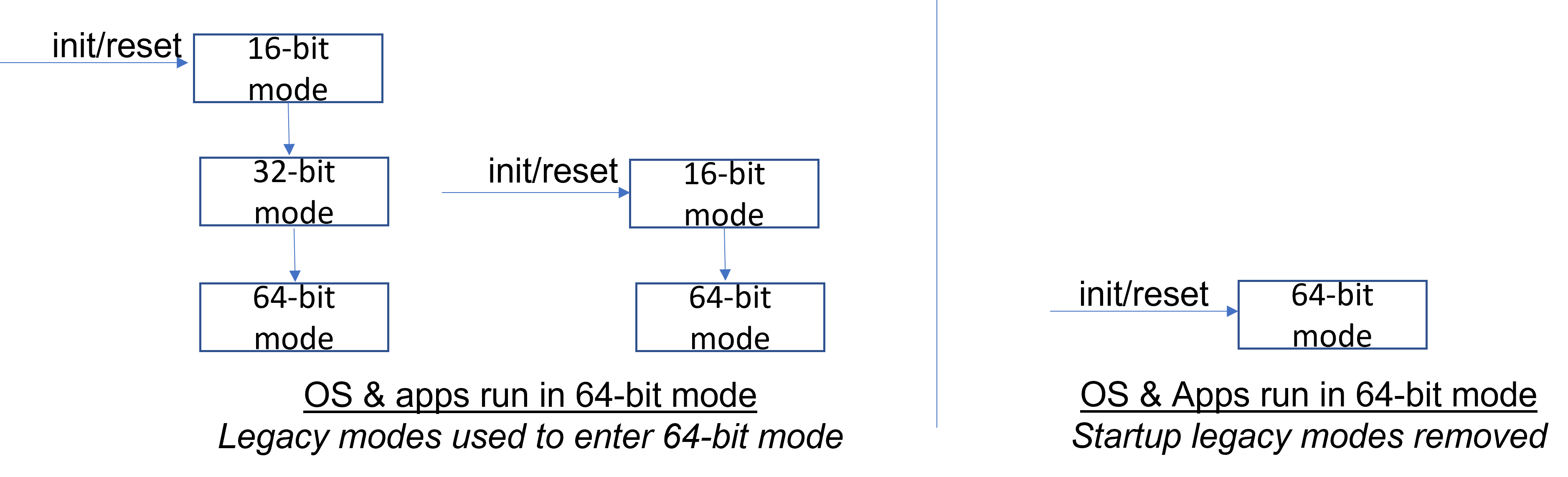 L’initiative X86S avait été officialisée en mai 2023. Elle avait eu droit à une révision 1.2 en juin dernier. L’idée générale était un grand ménage dans les instructions pour aboutir à une version exclusivement 64 bits (avec toutefois une prise en charge du code 32 bits maintenue via un mode de compatibilité). Intel parlait « d'achever la transition vers une architecture 64 bits, en supprimant certains modes hérités du passé ». Pour mémoire, le x86 16 bits remonte à 1978 avec le développement du 8086 ; les instructions x86 32 bits (IA-32) datent du 386, un processeur produit à partir de 1985.