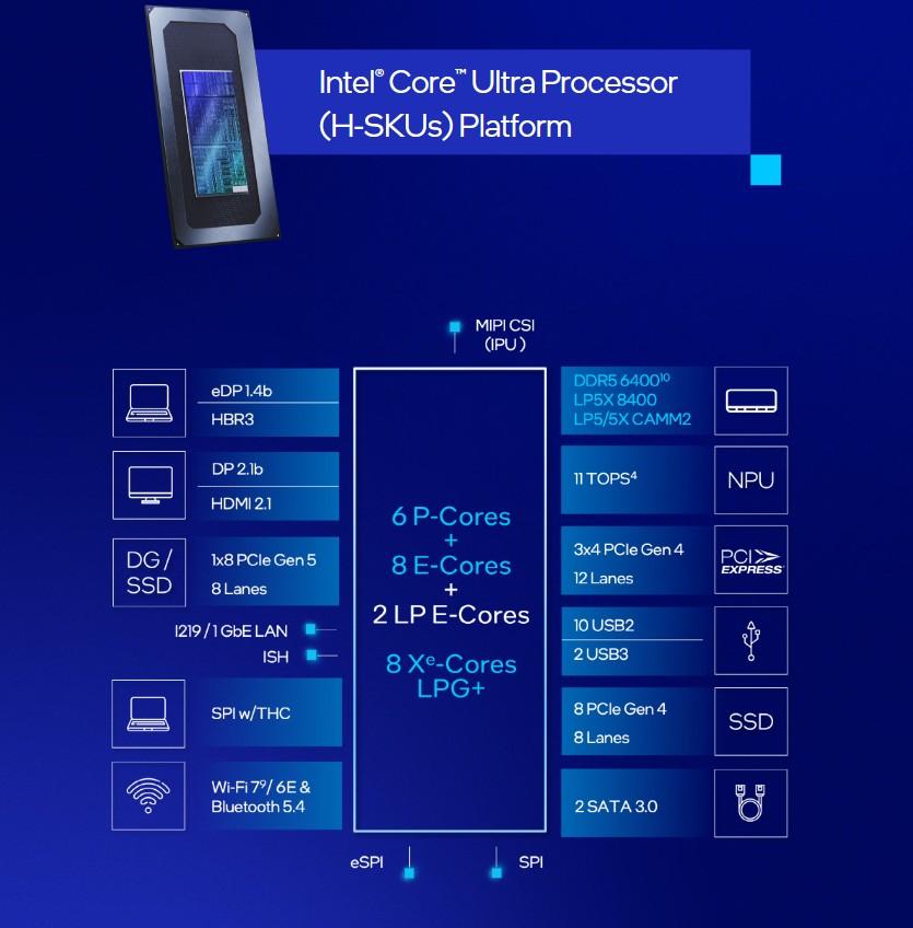 | Ultra 7 265H | 16 (6 + 8 + 2) | 2,2 / 5,3 GHz | 24 Mo | 8 Xe-Cores, jusqu'à 2,3 GHz | 1 x 8 PCIe 5.0 / 2 x 4 PCIe 4.0 | 28 W | 60 W |
