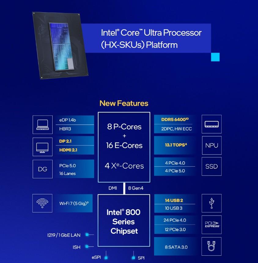 | Ultra 9 285H | 16 (6 + 8 + 2) | 2,9 / 5,4 GHz | 24 Mo | 8 Xe-Cores, jusqu'à 2,35 GHz | 1 x 8 PCIe 5.0 / 2 x 4 PCIe 4.0 | 45 W | 115 W |