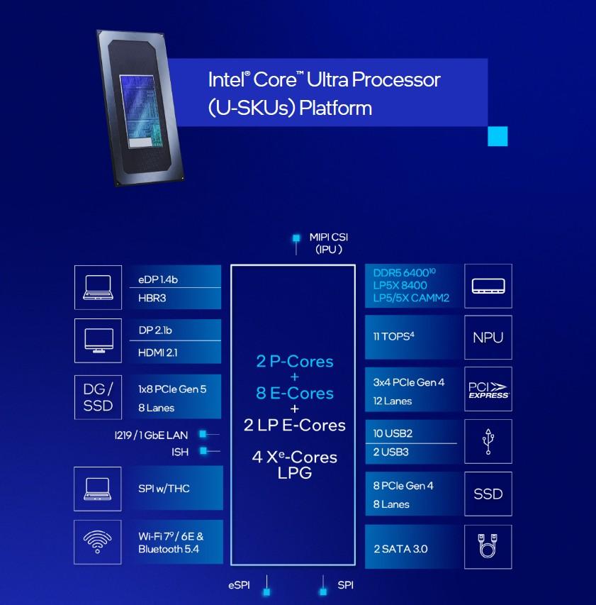 | Ultra 7 265U | 12 (2 + 8 + 2) | 2,1 / 5,3 GHz | 12 Mo | 4 Xe-Cores, jusqu’à 2,1 GHz | 2 x 4 PCIe 4.0 | 15 W | 57 W |
