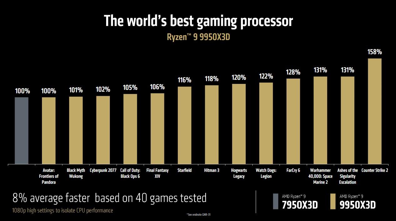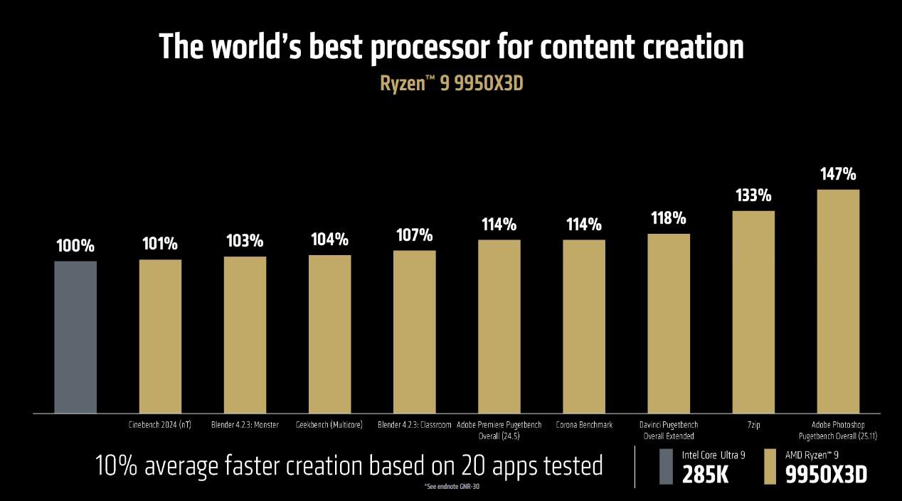 Par rapport aux Ryzen 9 7950X3D, AMD revendique en moyenne 8 % d’IPS en plus dans 40 jeux en 1080p ; 20 % par rapport au porte-étendard d’Intel, le Core Ultra 9 285K. Pour la création de contenu avec une base de 20 applications, les gains vis-à-vis des deux concurrents susmentionnés sont de respectivement 13 % et 10 %. Comme toujours, recevez ces revendications partiales avec un certain scepticisme.