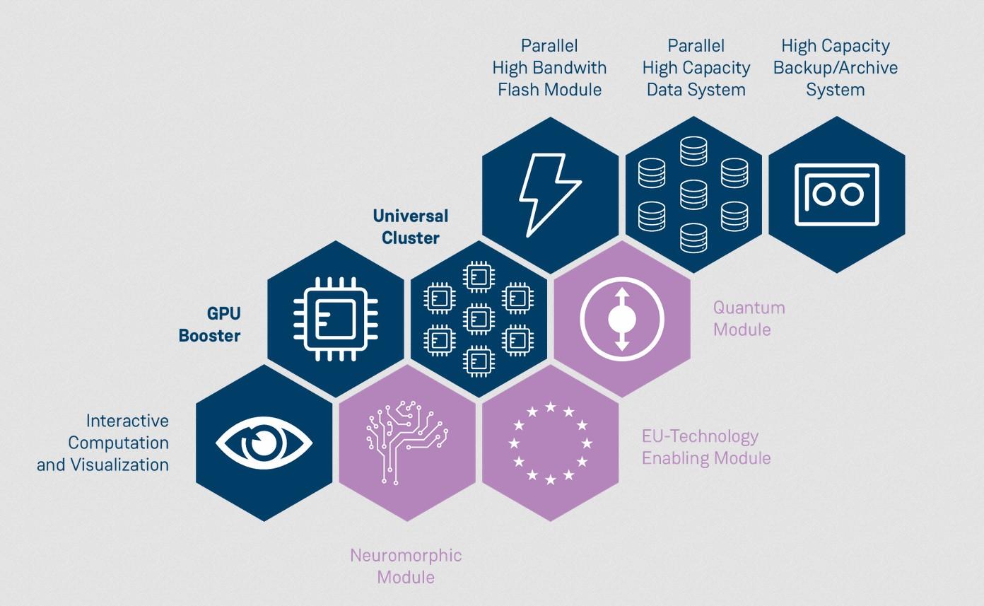 Le module Cluster, qui accueillera les CPU Rhea1, doit être déployé mi-2026, pour une mise en service complète d’ici la fin de l’année. Une documentation technique publiée par l’exploitant en début d’année indique qu’il regroupera plus de 1300 nœuds, avec une puissance attendue supérieure à 5 pétaflops (FP64, HPL). Chaque nœud comportera deux processeurs Rhea1, soit 2 × 80 cœurs Neoverse Zeus avec unités vectorielles SVE, 2 × 64 Go de HBM2E et 512 Go de DDR5, voire 1 To sur certains nœuds spécialisés.