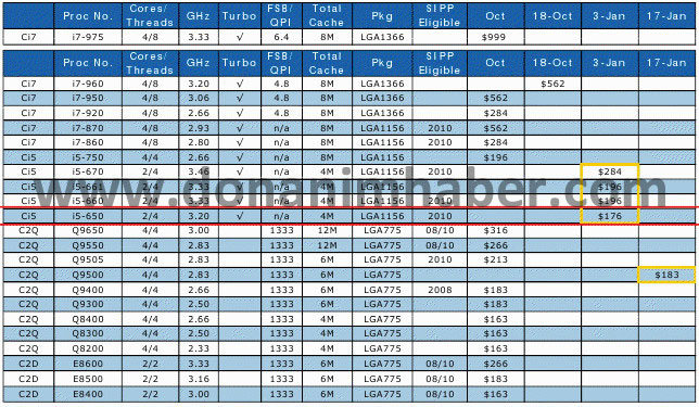 Le site Donanimhaber a en effet mis la main sur une roadmap de sortie de nouveaux CPUs d'Intel, qui indique l'arrivée des Clarkdale pour le 3 janvier 2010 comme prévu, mais également une autre série de nouveautés et baisses de prix pour le 17 janvier, et cette fois-ci sur socket LGA775.