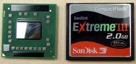 Pour bien montrer la petitesse du processeur, il a été mis à côté d'une carte compact flash, qui pour rapel affiche des dimensions de 42.8*36.4mm.