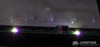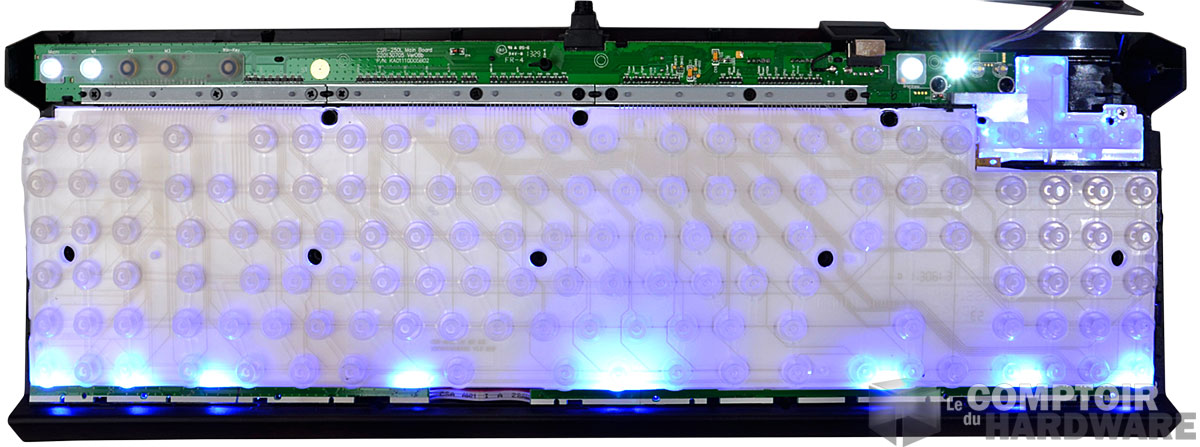 Comme nous sommes curieux comme des vieux cochons au Comptoir, nous avons voulu savoir comment fonctionnait ce rétroéclairage presque unique, et peut être trouver une explication à la faiblesse de son intensité. Quelques coups de tournevis aidant, une fois le capot supérieur du clavier désolidarisé du châssis on obtient la réponse : ce n'est ainsi pas un rétroéclairage uniforme du layout, mais une barre d'éclairage constituées de 8 LED RGB insérées au bas de l'ensemble membrane + matrice qui arrose l'ensemble du dispositif. Cette dernière illumine une plaque en plexiglass sur laquelle repose le tout, dotée de motifs sérigraphiés sous chacune des touches destinés à réorienter le flux lumineux vers le dôme caoutchouc, qui s'illumine alors. On a déjà pu voir ce dispositif sur le célèbre Illuminated Keyboard de Logitech avec le résultat réussi qu'on connait, à la différence que ce dernier a des touches plates.