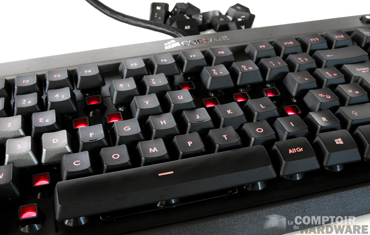 Les LEDs du bandeau supérieur attirent d'autant plus l'oeil que le clavier propose un rétroéclairage complet sur toute l'étendue du layout, personnalisable en intensité et en couleur, puisque Corsair a retenu des LEDs RGB pour le backlighting. Même si les 16,7 millions de nuances annoncées frisent avec la blague, on peut obtenir une belle variation des tonalités afin de personnaliser son clavier selon les circonstances ou les désirs de madame (chacun son truc, hein).