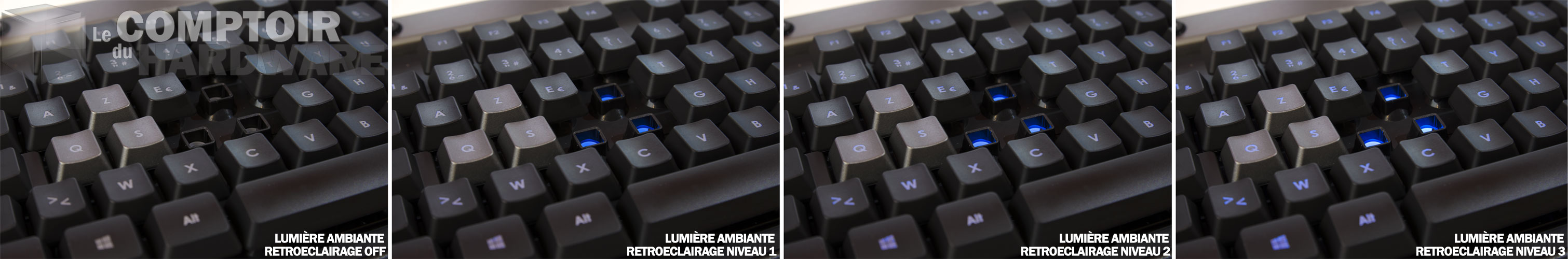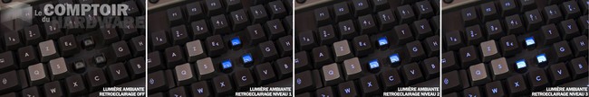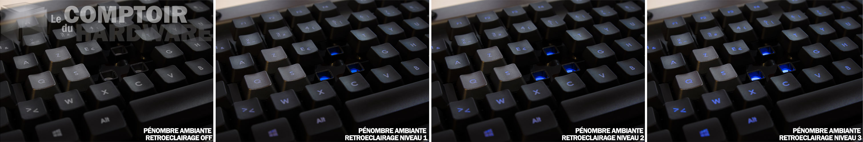 Lorsque la pénombre est de mise, le problème est forcément moins flagrant, mais même à son niveau maximal l'intensité lumineuse des touches s'avère rester discrète. Il nous aurait semblé plus logique de pouvoir régler à la baisse une luminosité des touches trop puissante (comme sur les K90/K95 de la même gamme) pouvant plaire à certaines et moins à d'autres, plutôt que d'avoir 2 modes d'intensité qui ne servent quasi à rien puisqu'à priori, si on achète ce clavier c'est aussi pour ses capacités de rétroéclairage.