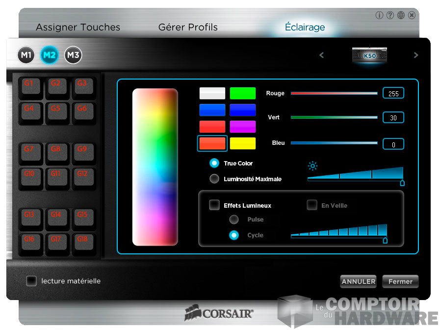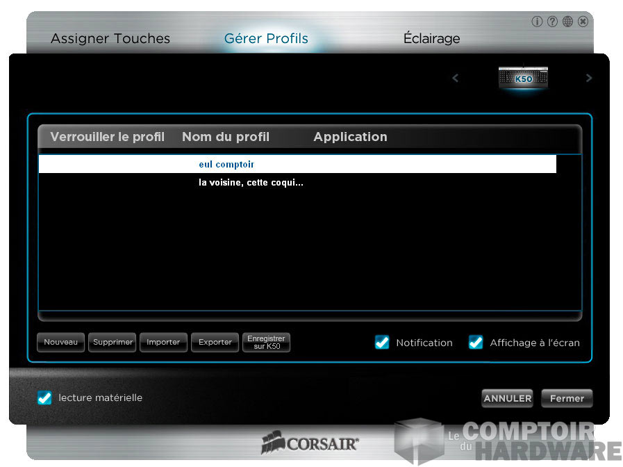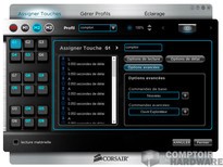 Le K50 est évidemment livré avec sa panoplie software, un pilote et un petit logiciel résidant permettant en sus de ce dont nous avons parlé plus haut, de gérer ses profils, enregistrer des macro commandes ou encore d'assigner en justice les touches G1 à G18 comme bon nous semble. Comme d'habitude, la partie logicielle chez Corsair ne brille ni par son ergonomie ni par ses qualités techniques et pas vraiment par ses qualités esthétiques ; mais cela fonctionne et c'est bien tout ce qu'on lui demande.
