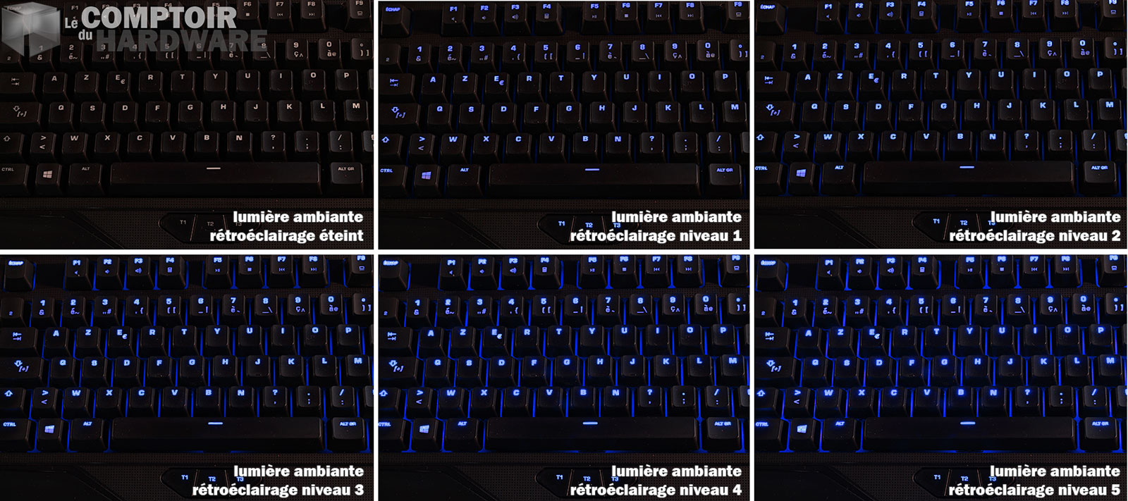 Vous aurez donc une DEL bleue par touche avec une intensité réglable sur 5 niveaux. Ça n'est que pour l'utilisation standard, le logiciel permettant d'aller plus loin. Les deux premiers niveaux seront pour les fragiles des yeux, le 5e est bien présent, sans être agressif. L'ensemble est uniforme, une DEL par touche oblige. À la place d'un blabla sans fin à ce sujet, on vous propose une petite démo en vidéo histoire de se faire une idée.