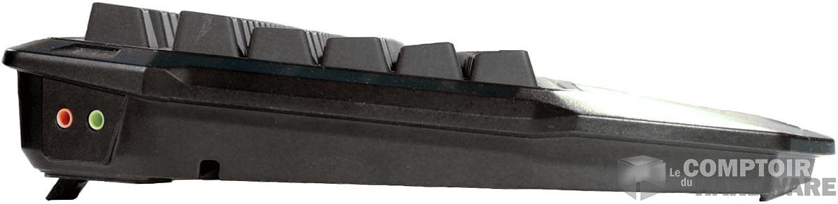 Pour le layout, ce sont 113 touches, 5 macros et 3 touches programmables sous le pouce qui sont mises à disposition, l'angle arrière droit abrite un hub USB 2.0 (si ce n'est pas malheureux à l'heure de l'USB 3.0) à deux ports et l'angle arrière gauche les connectiques casque et micro. En plus des macros, une touche FN (fonction) placée à côté de la touche Alt GR permettra d'utiliser les touches Fx afin de leur donner d'autres fonctionnalités : multimédias (Play/Pause/Stop/précédent/suivant) pour les touches F5 à F8, gestion du son (mute/+/-) de F1 à F3, calculatrice avec F4 (très utile pour le gamer qui calcule ses perfs en jeu), accès direct au poste de travail avec F9, à internet (ou page d'accueil du navigateur) avec F10, gestion du niveau de rétroéclairage avec F11 et enfin enregistrement de macro via F12. Pour ceux d'entre vous qui n'ont jamais eu l'occasion d'utiliser un clavier mécanique équipé de touches macro, il vous arrivera certainement d'aller flirter avec les touches M4 et M5 à la recherche des touches CTRL et SHIFT, un temps d'adaptation sera nécessaire et les plus nerveux seront heureux de voir qu'il faudra plus que quelques coups de poing pour venir à bout de l'ensemble (pour le bureau en dessous on ne promet rien par contre). Nous déclinons toute responsabilité, ce n'est aucunement du vécu (pensez-vous...) et nous n'avouerons que sous la torture.