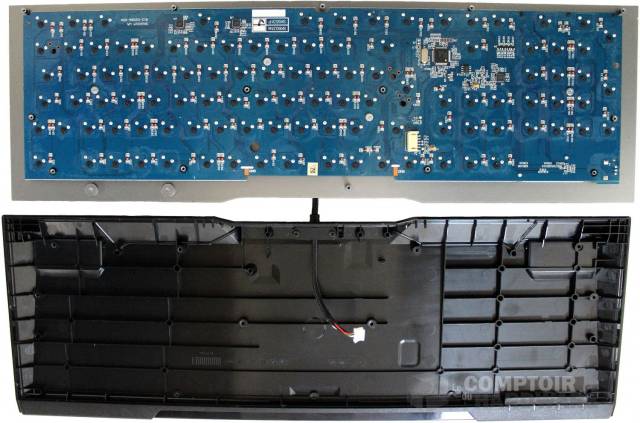 Une fois sous le capot, trois vis supplémentaires retiennent toujours le PCB à la plaque en aluminium. Malheureusement, la tête en croix d'une des trois vis refusait ici les avances répétées (et trop brutales ? #notguilty) de notre tournevis, on a donc abandonné cette idée. Mais même avec deux vis en moins, le PCB ne présentait absolument aucun jeu, ce qui sous-entend concrètement que chaque touche est assez solidement arrimée de la plaque aluminium au PCB. Précisions ici aussi que tous les pas de vis font partie intégrante de la plaque en aluminium du clavier. Il est évident que ce dernier profite ainsi d'une ossature résistante et confirme l'impression de solidité initiale laissée par l'ensemble. Peut-être aussi une bonne chose pour un constructeur qui n'a pas vraiment la meilleure des réputations en matière de qualité de fabrication.