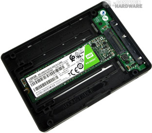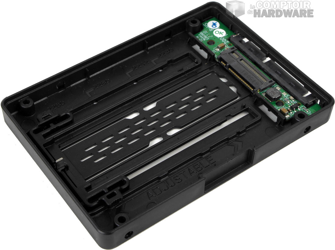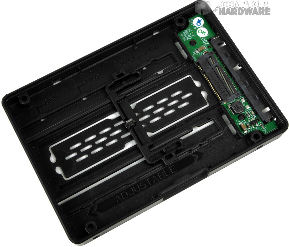 L'adaptateur est entièrement aéré pour éviter la surchauffe à l'intérieur. Pour l'ouvrir, point de vis, juste un petit loquet à presser pour retirer le capot. On peut ensuite apprécier le PCB qui accueillera votre SSD M.2. Quatre formats sont acceptés, du 2230 au 2280 et il est compatible SATA III 6Gbps.