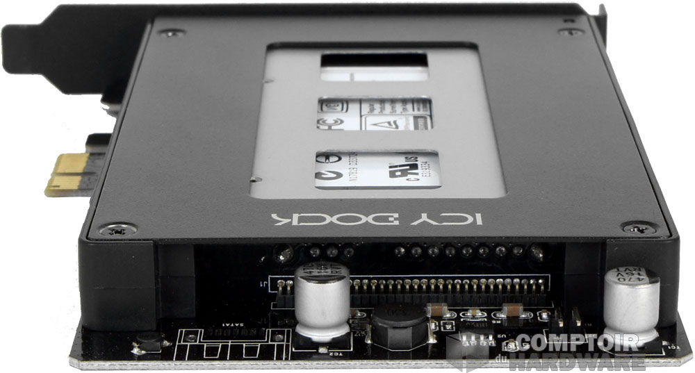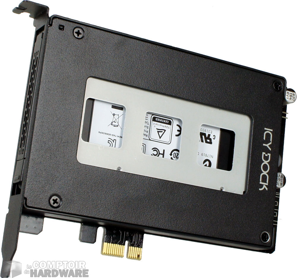 L'installation se fait en quelques minutes. Trouvez un port PCIe libre (1X, 4X, 8X ou 16x), placez l'adaptateur, vissez-le au slot PCIe correspondant de votre boîtier et voilà. En ce qui concerne l'unité de stockage, il suffit de la visser sur le rack amovible. Au démarrage du PC, le SSD que nous avons installé est reconnu immédiatement.