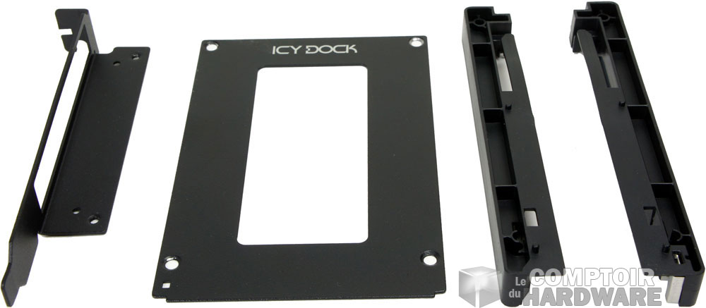 Pour maintenir en place votre unité de stockage, l'adaptateur est livré avec un support à éjection rapide comme on en trouve sur tous les produits Icy Dock en 2.5". La marque garantit son produit pour 10 000 insertions/retraits, ou trois ans si vous n'arrivez pas jusque là. C'est tout pour la présentation, puisque le produit reste assez simple dans sa conception.