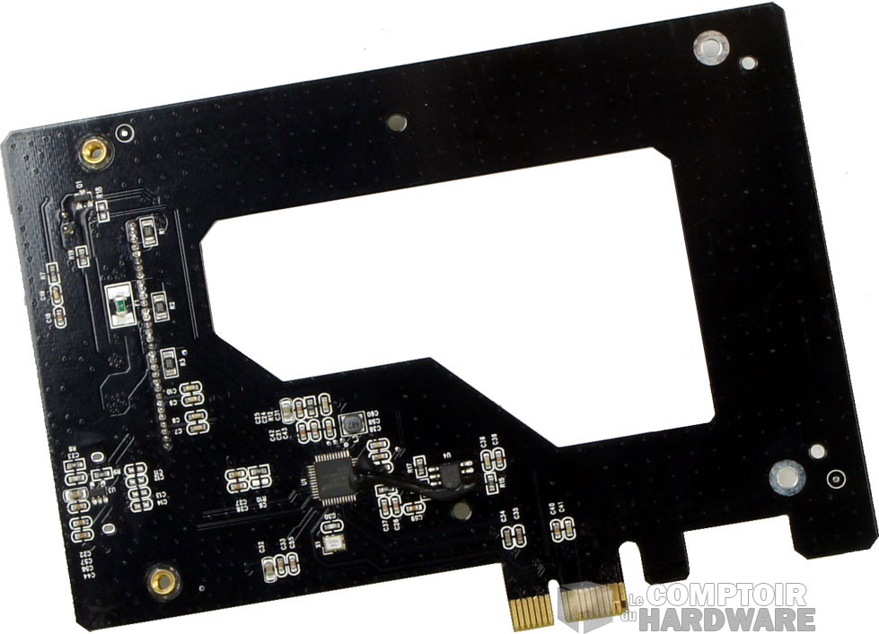 L'adaptateur se compose d'un PCB qui accueille toute la connectique et d'un châssis en métal et plastique. Sur le PCB vous aurez le connecteur PCIe, le SATA et le Power SATA pour alimenter votre stockage. Le reste du châssis est en quatre parties : équerre PCIe, support pour le cadre et cadre en acier. L'alimentation se fera via le port PCIe de votre machine.