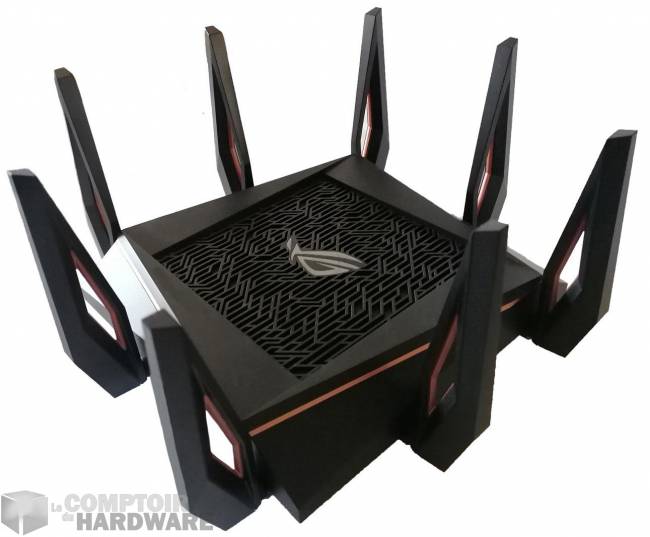Le ASUS ROG RAPTURE GT-AX11000 - avouez que le nom vous en bouche un coin - vient se rajouter à la série de routeurs GT de chez ASUS. Nous sommes donc en face d'un produit gaming ROG pensé et destiné aux joueurs. Le routeur est équipé de 8 antennes externes, de quoi couvrir les grandes surfaces dans votre habitat, du moins en théorie. La norme 802.11ax est supportée, mais vous trouverez bien entendu une rétrocompatibilité avec les anciennes versions du Wi-Fi. Ainsi, vous n'aurez pas à vous soucier de savoir si le produit est compatible ou non, vous serez simplement bridés sur les débits. On pourra ajouter que le routeur est équipé des dernières normes de multiplexage, c'est à dire OFDMA et MU-MIMO, qui viendront améliorer la stabilité/latence de votre connexion. Les débits théoriques annoncés par ASUS sont de 4800 Mbps sur le 5 GHz et de 1200 Mbps sur le 2.4 GHz. Ce modèle est d'ailleurs compatible avec la sécurité WPA3 depuis la sortie firmwares de 2020.