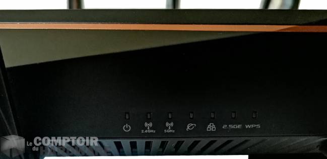 Pour le hardware à proprement parler, on trouve un CPU quad-core moulinant à 1.8 GHz, épaulé par 256 Mo de mémoire interne et 1 Go de mémoire vive. Au niveau des connectiques, on trouve cinq ports 1 GbE ainsi qu'un port 2.5 GbE, ce dernier permettra d'exploiter un lien compatible et de dépasser le plafond des 1 Gbit/s en local (à condition que le client soit compatible). Deux ports USB 3.1 viennent s'ajouter pour connecter des périphériques et utiliser par exemple votre routeur comme un petit serveur, dans le but de partager des fichiers avec les ordinateurs de votre domicile. Un bouton poussoir pour allumer le routeur est présent à l'arrière de la machine. Le bouton reset, bien dissimulé, vous permettra de remettre rapidement la configuration d'usine. Sur la tranche, des boutons WPS, Wi-Fi et Game Boost sont présents, ils permettront d'activer rapidement ces fonctions.